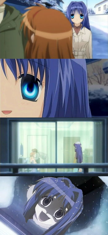 前段的交往劇情是看得我很不自然,如二人面紅、偷偷摸摸的動作等。因為一直與之前的女角都沒有出現過像現在這樣的交往狀況,所以總覺得現在的畫面並不是在 Kanon 中應該會看到的情景 XD。(雖則此作是類別是這個)